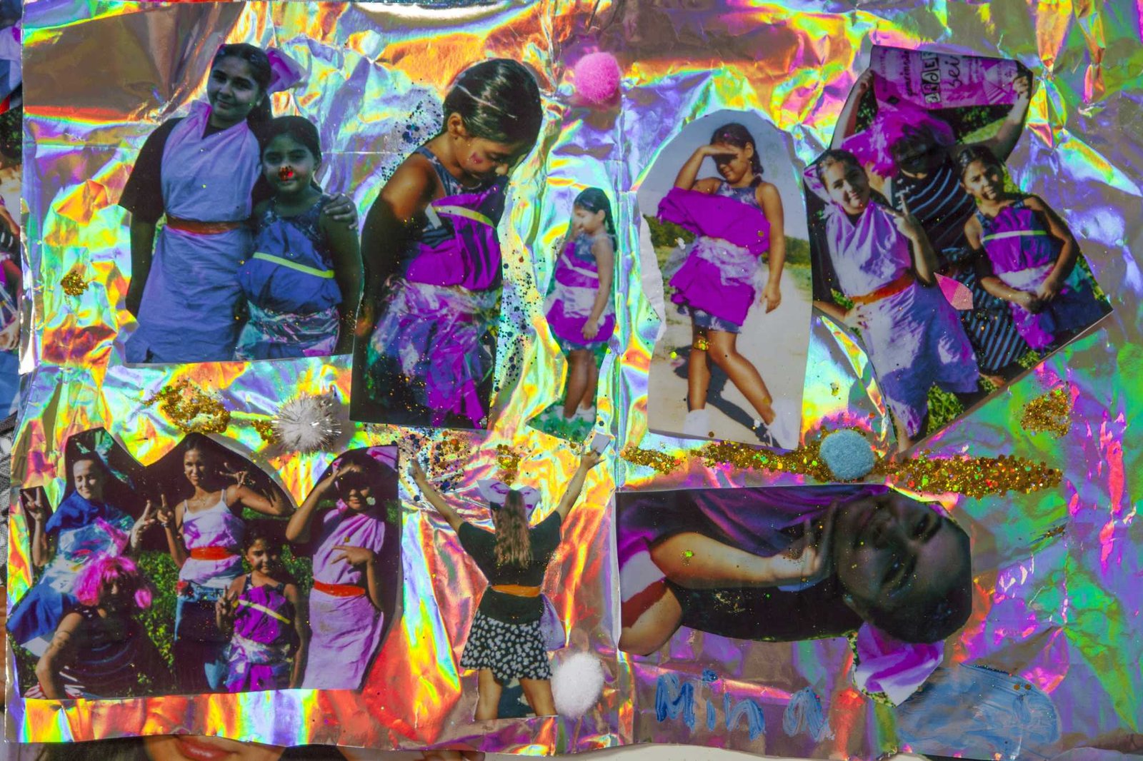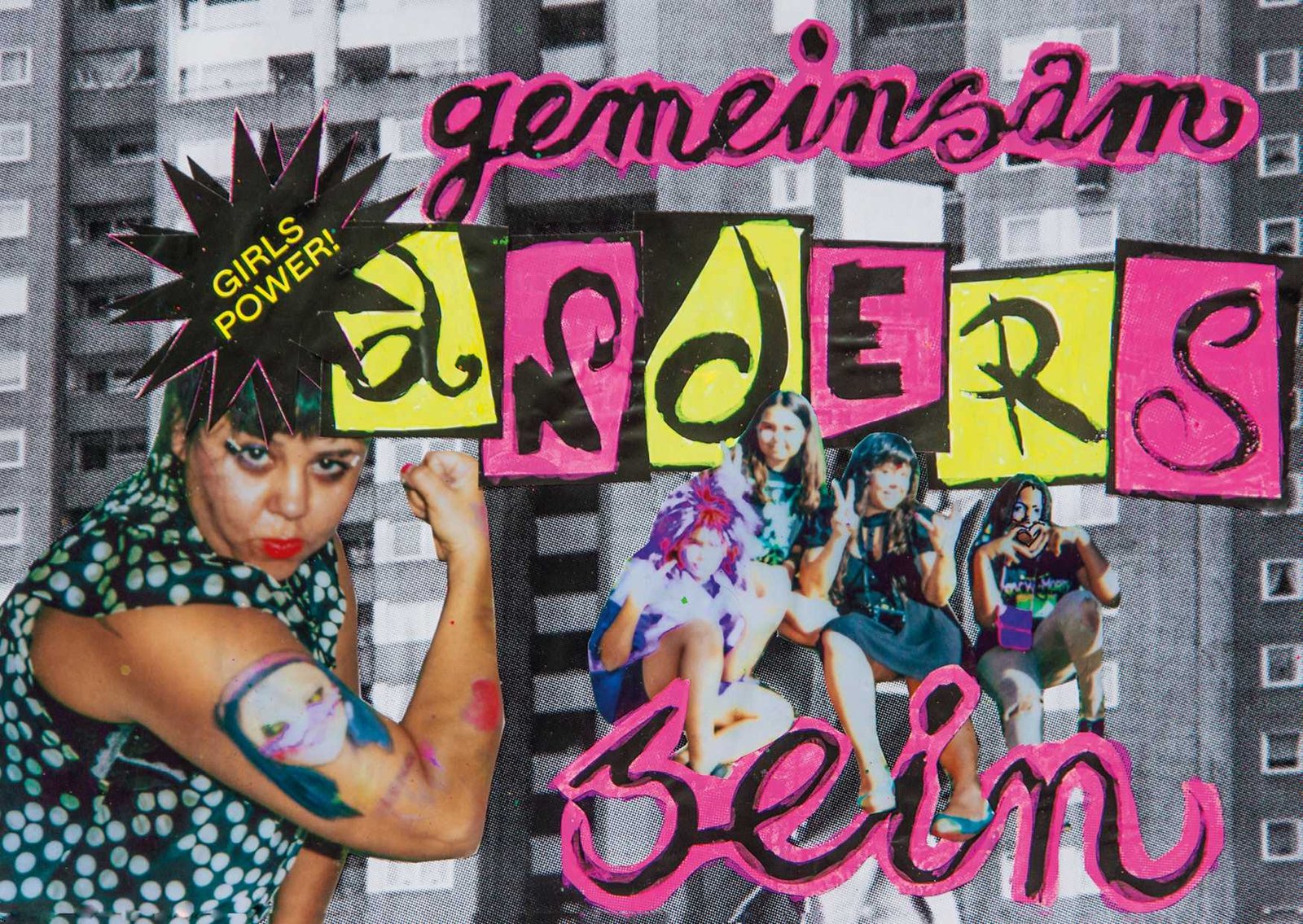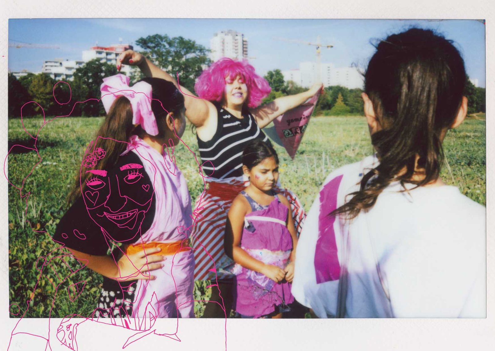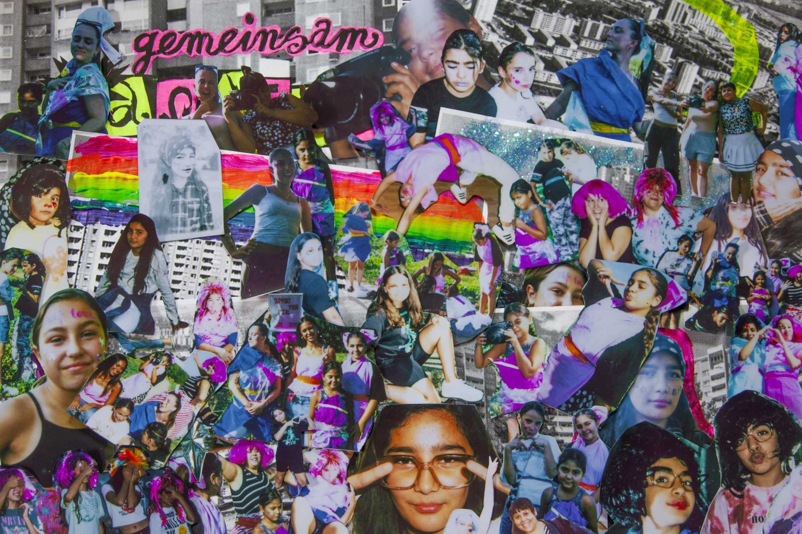 in Gropiusstadt, Berlin. Under the theme “Gemeinsam Anders Sein” — Being Different Together — the girls designed costumes, painted masks, and took instant analog portraits of one another, exploring self-expression through imaginative play. The process combined collage, drawing, painting, and glitter — a space for experimentation, self-confidence, and attunement to oneself: the simple but radical idea that being different is not just acceptable, but worth celebrating together. The project concluded with a public exhibition and a Leporello publication — the girls co-curated the final show, displaying their works alongside enlarged polaroids; for some, the connections built during the project lasted beyond it, including mentoring relationships that continued afterward.