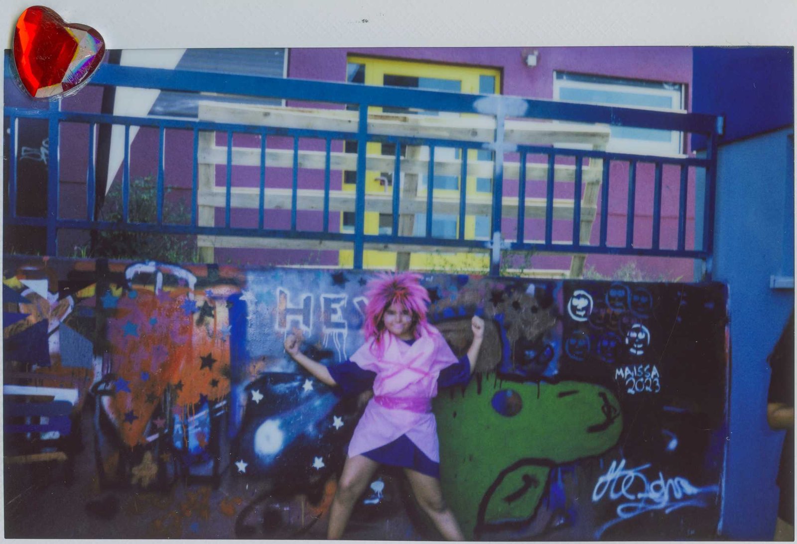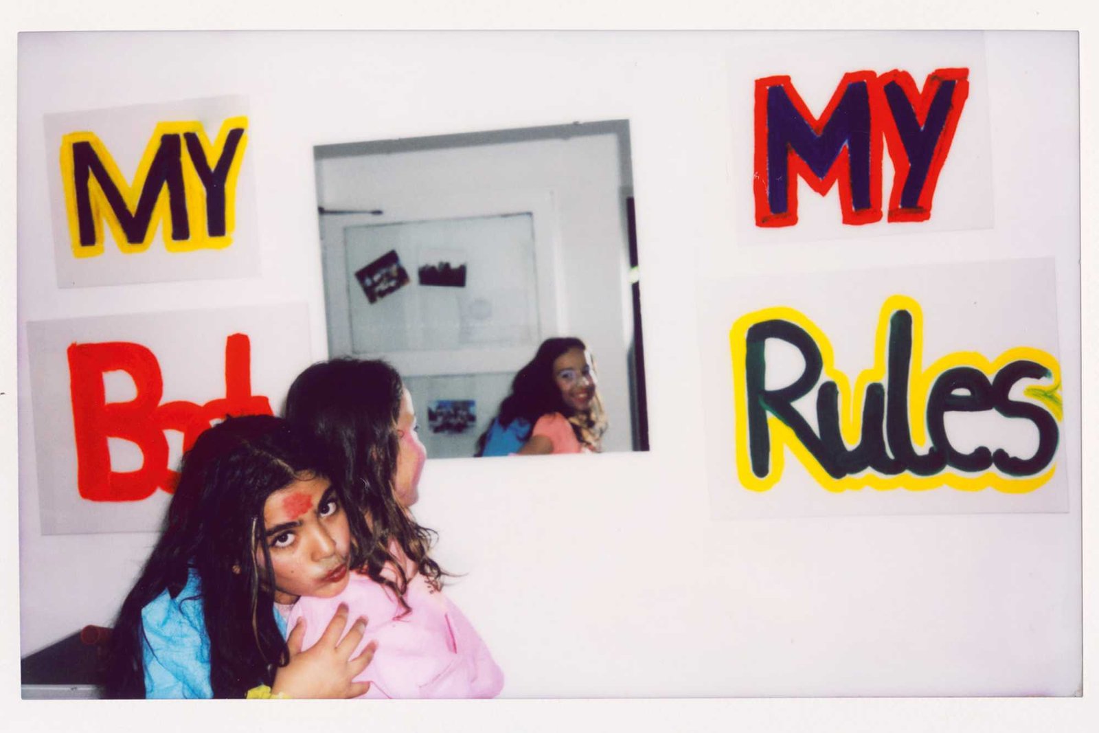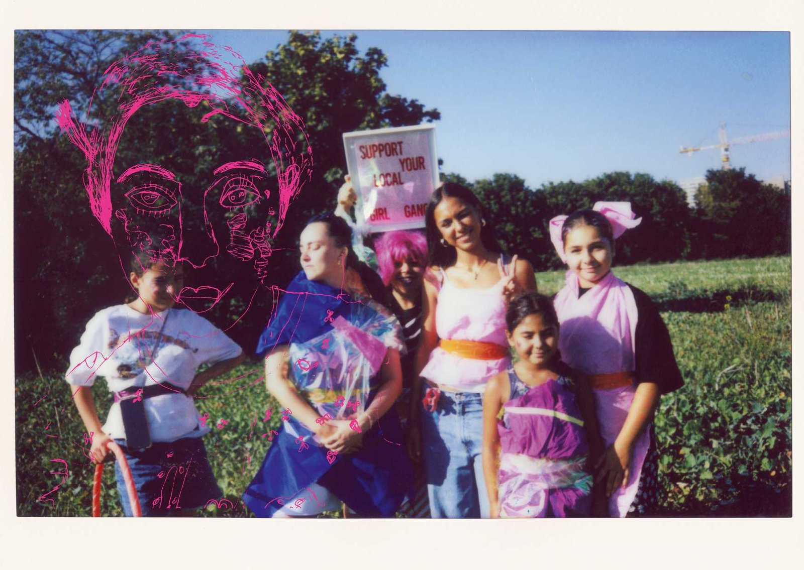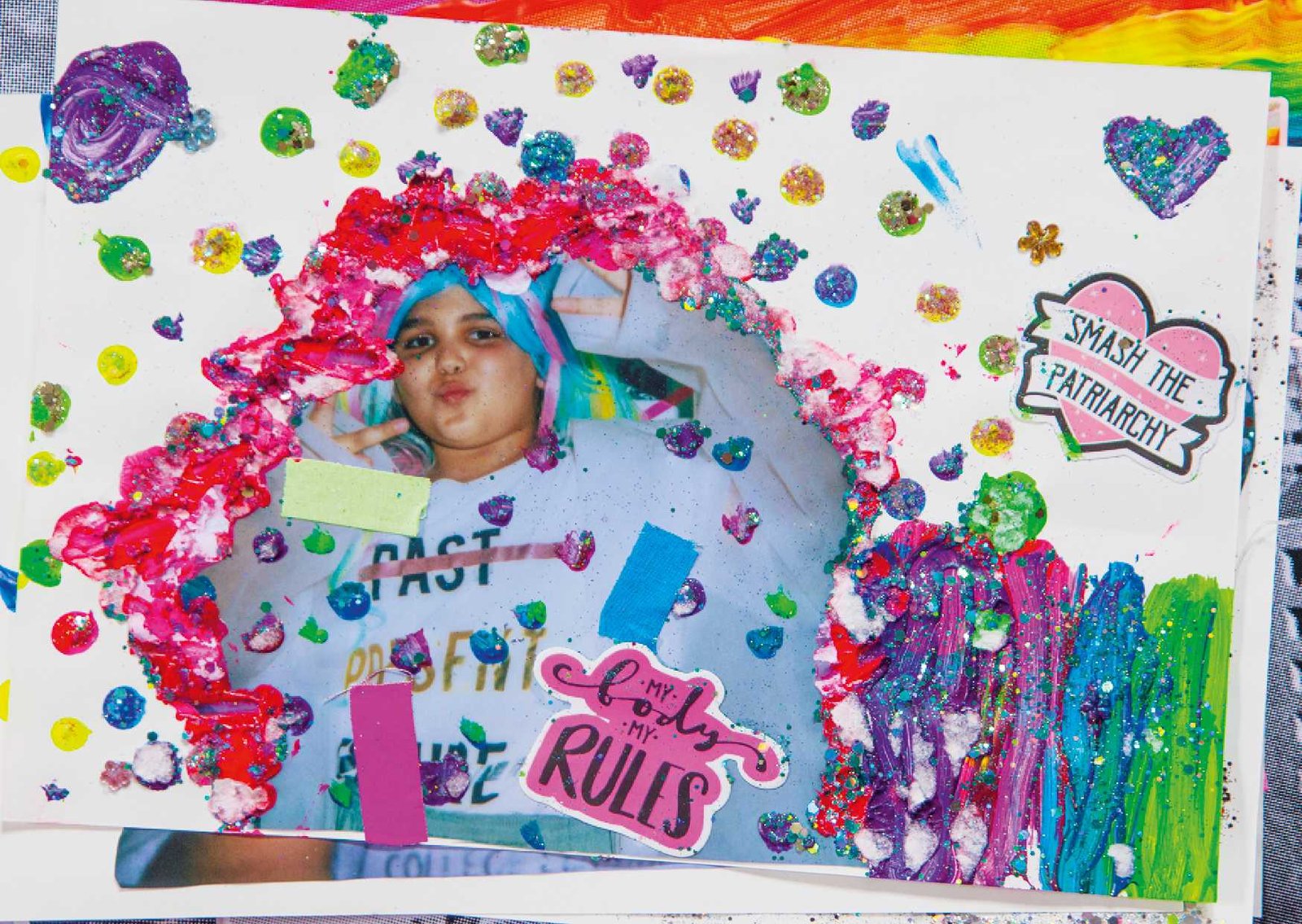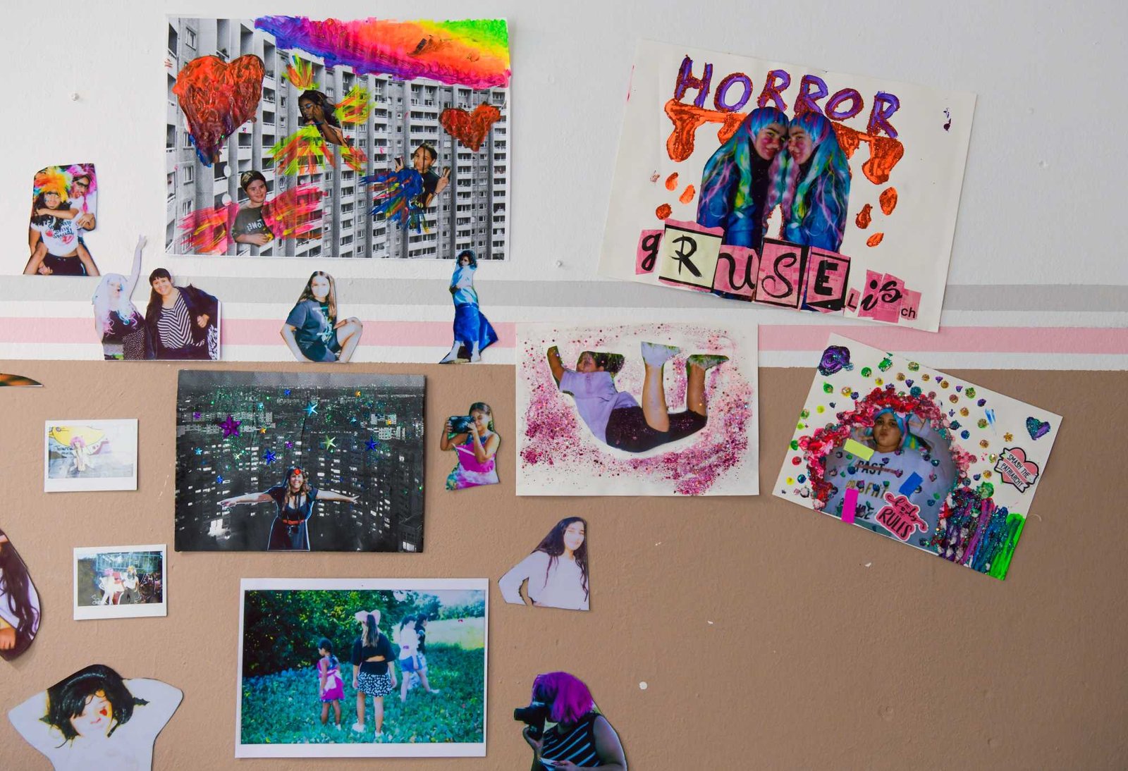 in Gropiusstadt, Berlin. Under the theme “Gemeinsam Anders Sein” — Being Different Together — the girls designed costumes, painted masks, and took instant analog portraits of one another, exploring self-expression through imaginative play. The process combined collage, drawing, painting, and glitter — a space for experimentation, self-confidence, and attunement to oneself: the simple but radical idea that being different is not just acceptable, but worth celebrating together. The project concluded with a public exhibition and a Leporello publication — the girls co-curated the final show, displaying their works alongside enlarged polaroids; for some, the connections built during the project lasted beyond it, including mentoring relationships that continued afterward.